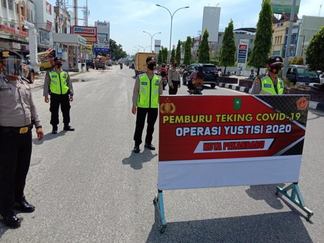 Petugas yang tergabung dalam Tim Pemburu Teking Covid-19 Operasi Yustisi Polresta Pekanbaru yang dilaksanakan hari Kamis tanggal 24 September 2020 pukul 10.00 WIB di jalan Tuanku Tambusai Pekanbaru, tim ini dipimpin Iptu Emir MB, Iptu Indra Bakti, Iptu Ade Juli Elvira dan Ipda Jon Hendri dan personel gabungan TNI-Polri, Satpol PP, Dishub, BPBD, Satgas pasar dan personel Polsek setempat.