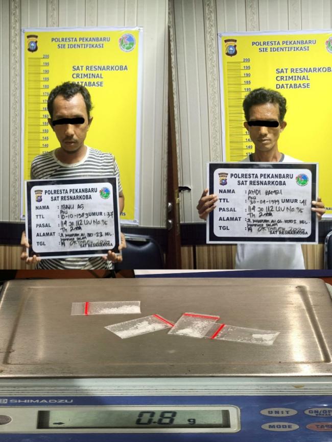 Kapolresta Pekanbaru Kombes Pol H.Nandang Mu'min Wijaya., S.I.K., M.H melalui Kasat Narkoba Akp Juper Lumban Toruan.S.I.K , Tersangka inisial IA alias Ibnu (37) dan inisial AZ alias Andi (41) keduanya warga kampung dalam ditangkap sebagai pengedar narkoba pada hari Selasa malam tanggal 12 oktober 2020 pukul 20.30 wib di jalan Khadijah Ali Kelurahan Kampung Dalam Kecamatan Senapelan