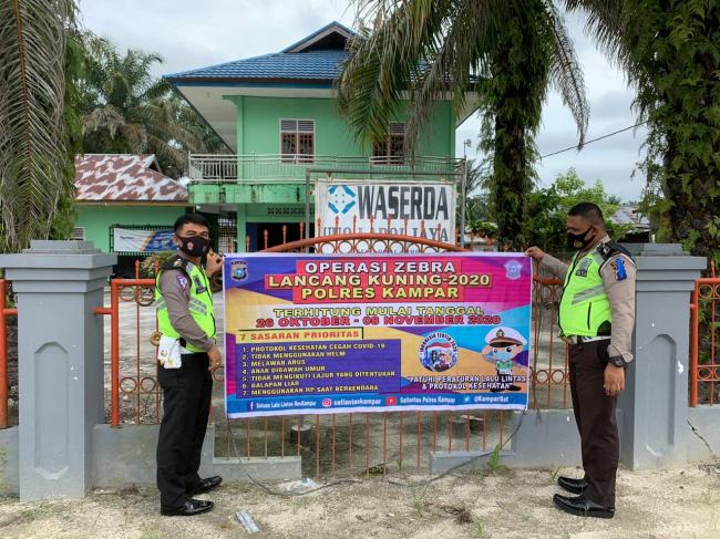 KAMPAR - Jajaran Satlantas Polres Kampar terus sosialisasikan pelaksanaan Operasi Zebra Lancang Kuning 2020 kepada masyarakat, sosialisasi ini disampaikan secara langsung dan juga melalui media cetak, media online, media sosial dan pemasangan spanduk, seperti yang terpantau pada Rabu kemarin (4/11/2020).