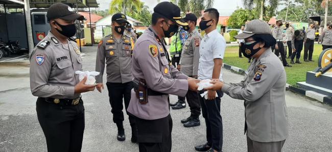 Kegiatan diawali penyerahan secara simbolis kepada perwakilan personel dari masing-masing Satker oleh Waka Polres Kampar, selanjutnya didampingi Kabag Ops AKP Rachmad Muchamad Salihi SIK, MH, dilanjutkan pembagian satu persatu secara bergiliran kepada seluruh personel dengan menerapkan Protokol Kesehatan.