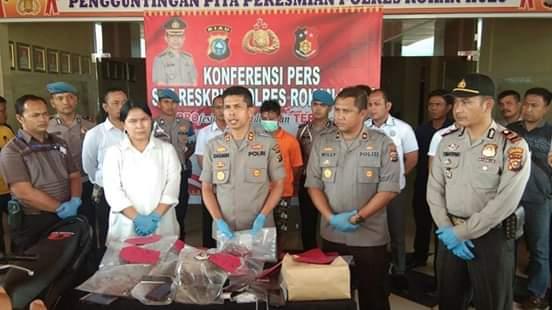 Kapolres Rokan Hulu AKBP Dasmin Ginting, S.I.K di dampingi Wakapolres Kompol Willy Kartamanah, para Kabag,Kasat Reskrim AKP Aslely Farida Turnif,Kapolsek Tambusai dan personil lainnya menggelar konferensi pers di Mako Polres Rokan Hulu, Jalan lingkar Desa Suka Maju,Kecamatan Rambah. Pada Rabu (30/10/2019) siang.