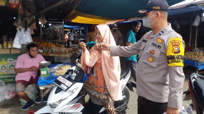 PEKANBARU - Persempit ruang gerak penyebaran Covid-19, Kepolisian Sektor (Polsek) Sukajadi bagikan masker gratis kepada pedagang dan pengunjung Pasar Cikpuan Jalan Tuanku Tambusai/ Nangka Kelurahan Jadirejo Kecamatan Sukajadi Kota Pekanbaru, Jum'at 05 Februari 2021 pagi.