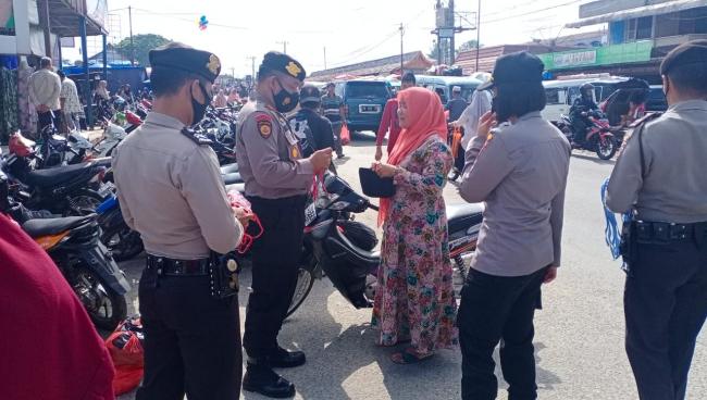 Kasat Sabhara Bersama Kapolsek Bangkinang Barat Bagikan Masker di Pasar Kuok Kampar