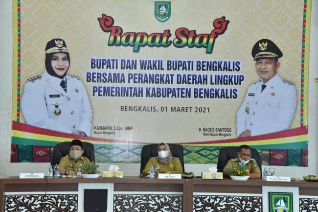 BENGKALIS,membacabangsa.co.id - Bupati dan Wakil Bupati Bengkalis Kasmarni dan H Bagus Santoso, pimpin rapat staf perdana bersama Kepala Perangkat Daerah di Lingkup Pemerintah Kabupaten Bengkalis, Senin (1/03/21) pagi, di Ruang Rapat Dang Merdu Kantor Bupati Bengkalis.