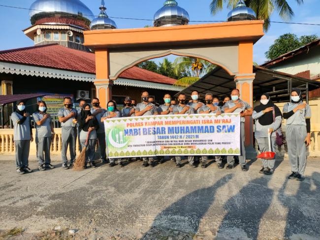 Polres Kampar Gelar Bakti Sosial Bersihkan Masjid Dalam Rangka Peringati Isra Mi,raj 1442-H