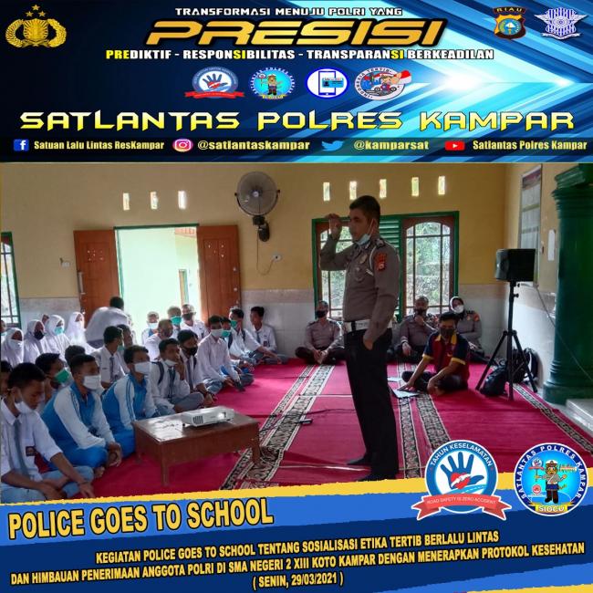 KAMPAR - Sejumlah personel dari Satuan Lalulintas Polres Kampar menggelar kegiatan Police Goes to School di SMA Negeri 2 Kecamatan XIII Koto Kampar, pada Senin pagi (29/03/2021).