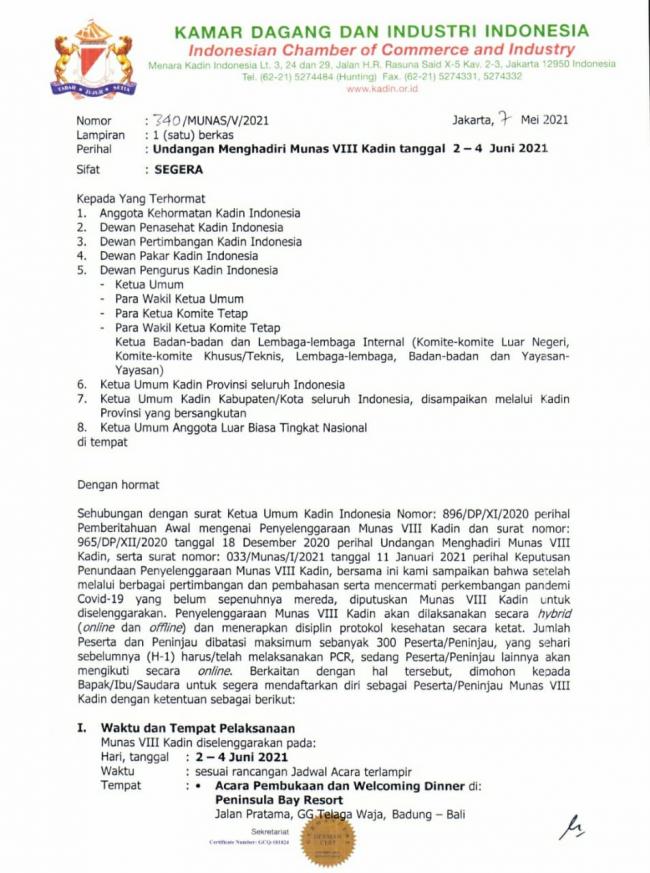 Salah satu bukti konkret bahwa tidak adanya Dualisme Kepengurusan KADIN ialah, diterimanya undangan Munas VIII KADIN yang akan dilaksanakan pada tanggal 2 - 4 Juni 2021 mendatang dari Panitia Penyelenggara Munas VIII di tandatangani oleh Adisatrya Sulisto kepada Kadin Bengkalis yang diketuai oleh Masuri, SH melalui Kadin Provinsi yang di Ketuai oleh Juni Ardianto Rachman.