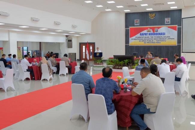 PEKANBARU - Kapolda Riau Irjen Pol Agung Setya Imam Effendi, SH, SIK, M.Si. menggelar rapat koordinasi posko PPKM Mikro di area publik dan wilayah tertentu Se-Provinsi Riau, di Aula Tribrata lantai 5 Polda Riau Jalan Patimura Nomor 13 Pekanbaru pada Jumat (4/6/2021)