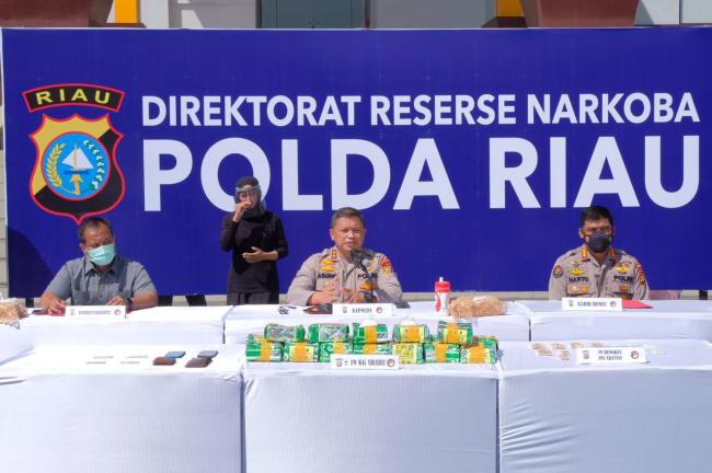 Kapolda Riau Irjen Agung Setia Imam Effendi SH SIK MSI menggelar konferensi pers bersama Direktur Reserse Narkoba Kombes Victor Siagian dan Kabid Humas Kombes Sunarto di Mapolda pada Selasa (22/6) mengatakan jajaran Polda Riau tetap menggelorakan perang dalam melawan narkoba.