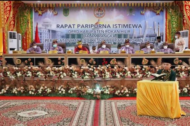 Dalam kesempatan itu Bupati Rohil Afrizal Sintong dalam sambutannya mengatakan, "Rasa syukur, kehadirat Allah SWT/ Tuhan Yang Maha Esa, atas segala limpahan rahmat dan Karunia-Nya, saat ini kita masih diberikan kesehatan dan kesempatan, sehingga kita dapat menghadiri Sidang Paripurna Istimewa Dewan Perwakilan Rakyat Daerah Kabupaten Rokan Hilir, dengan agenda pokok dari perayaan memperingati hari jadi Kabupaten Rokan Hilir Ke 22 Tahun 2021, "Terangnya.