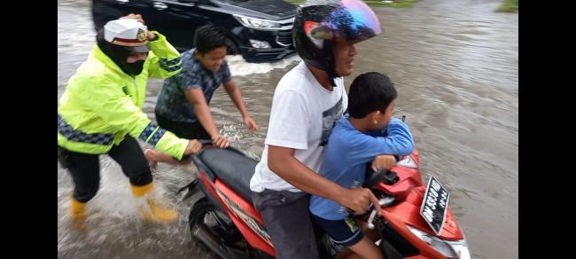Dengan mengenakan mantel hujan dan bersepatu bot plastik AKP Akira Ceria bersusah payah mendorong sepeda motor Yamaha Mio milik pemotor yang mogok akibat menerjang genangan air.