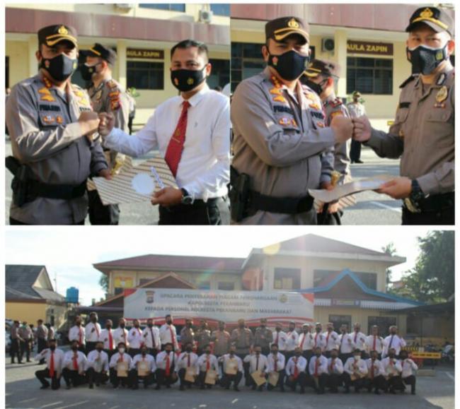 Kapolresta Pekanbaru Gelar Upacara Penyerahan Piagam Penghargaan Kepada Personel Polresta Pekanbaru