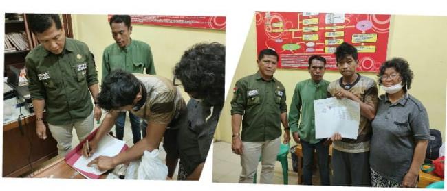 Setelah selesai proses perdamaian dan pencabutan pengaduan tersebut, selanjutnya pelapor dan pelaku (ibu dan anak) tersebut menandatangani surat pernyataan yang telah dibuat, dihadapan Lurah dan Tokoh Masyarakat serta beberapa warga yang menjadi saksi.