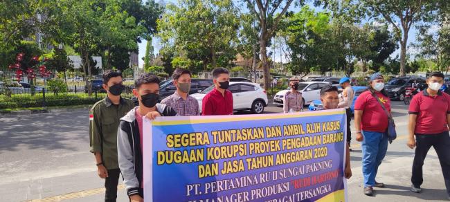 Dalam pantauan media ini, Kordum Hukmul Fikri dan Korlap Aksi M. Rio Azlani Alhafiz menyampaikan tujuan dari aksi ini atas keprihatinan Kami berkaitan dengan proses penyelidikan dugaan tindak pidana Korupsi pengadaan barang dan jasa tahun anggaran 2020 senilai 3,6 Miliyar yang melibatkan Manager Produksi PT. Pertamina RU II Sungai Pakning yang mangkrak di kejaksaan Negeri Bengkalis saat ini.