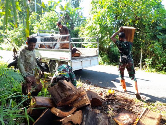 Maluku Tengah, Dalam rangka meningkatkan sinergitas antara TNI dan Rakyat, Satgas Pengamanan Maluku Batalyon Arhanud 11/WBY Pos 4 Saleman bersama masyarakat Negeri Saleman saling gotong royong mencari kayu bakar di hutan, kayu tersebut akan digunakan untuk memasak di rumah duka warga Negeri Saleman, Kecamatan Seram Utara, Kabupaten Maluku Tengah, Kamis (9/12/2021).