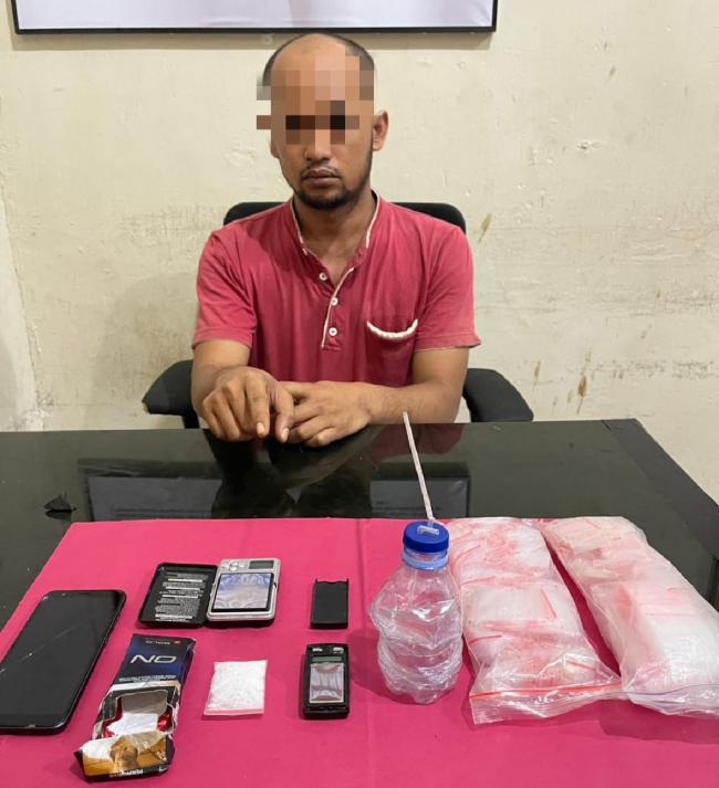 Dari tersangka ditemukan barang bukti 1 paket narkotika jenis shabu terbungkus plastik bening dalam Kotak rokok On Bold, serta sejumlah barang bukti lainnya terkait kasus ini.