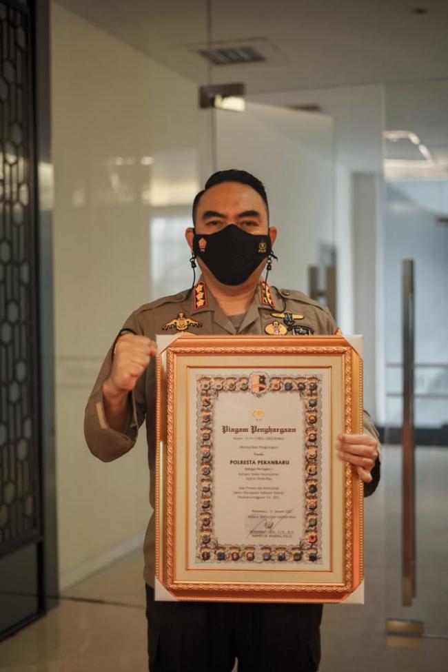 "Alhamdulillah atas pencapaian penghargaan ini, tentu saya ucapkan terimakasih kepada seluruh anggota Polresta Pekanbaru yang bekerja dengan baik, kedepan dengan adanya capaian ini mampu lebih meningkatkan kembali kualitas kerja sehingga mampu mendukung pencapaian tujuan dan sasaran pembangunan guna memberikan pelayanan yang terbaik,"Ucap Kapolresta Pekanbaru