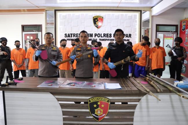 Bersama 17 orang pelaku ini, turut diamankan barang bukti berupa 2 buah senjata tajam jenis Pisau, 3 buah kayu, 1 buah ketapel, 2 buah besi, 3 buah senjata tajam jenis parang, Hanphone, 2 buah tongkat, 2 buah busur panah berikut 2 anak panah, 1 buah samurai, dan 1 buah bambu runcing.