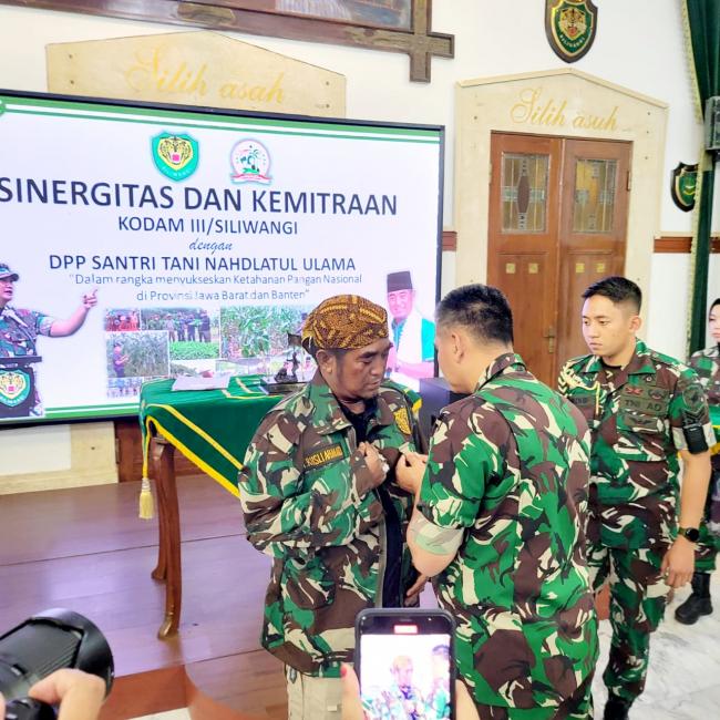 Pangdam III/Siliwangi Mayjen TNI Kunto Arief Wibowo S.IP menandatangani perjanjian kerjasama dengan Ketua Umum DPP Santri Tani Nahdlatul Ulama T. Rusli Ahmad SE MM dalam rangka sinergitas dan kemitraan untuk menyukseskan ketahanan pangan di gedung Aula Siliwangi, Makodam III/Slw Jalan Aceh No. 9 Kota Bandung.