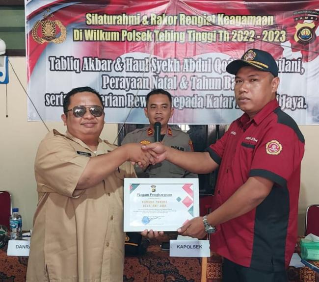 Jambi membacabangsa.co.id. ketua karang taruna TARUNA JAYA desa Adi Jaya ucapkan terimakasih kepada Kapolsek Tebing Tinggi,atas pemberian piagam penghargaan di mapolsek Tebing Tinggi kecamatan Tebing Tinggi Kabupaten Tanjung Jabung Barat Jambi,