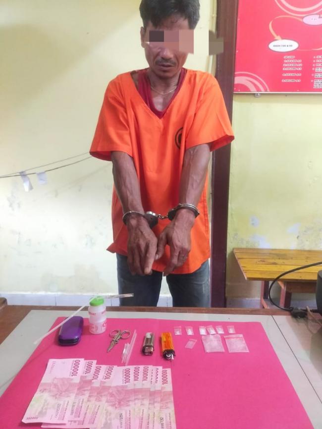 Selanjutnya dilakukan penggeledahan terhadap pelaku HG dengan disaksikan oleh aparat desa setempat, tim menemukan 6 (enam) paket kecil diduga Narkotika jenis Shabu yang dibungkus dengan plastik bening, uang tunai Rp.1.000.000 (satu juta rupiah), 3 sendok dari pipet, handphone samsung lipat warna ungu, kaca pirex, bong, gunting kecil, 2 mancis.