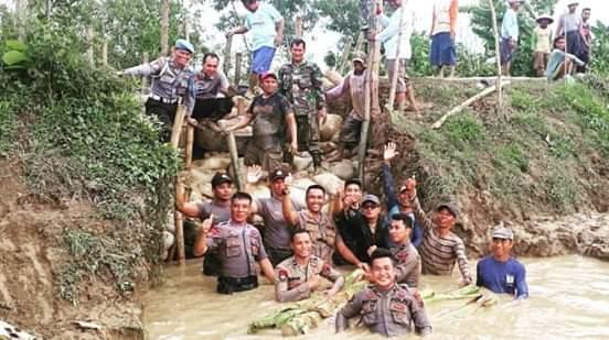 Semangat dan tetap kompak Petugas gabungan dari Polres Pati, Koramil dan warga bergotong royong membenahi tanggul yang jebol akibat gerusan air.