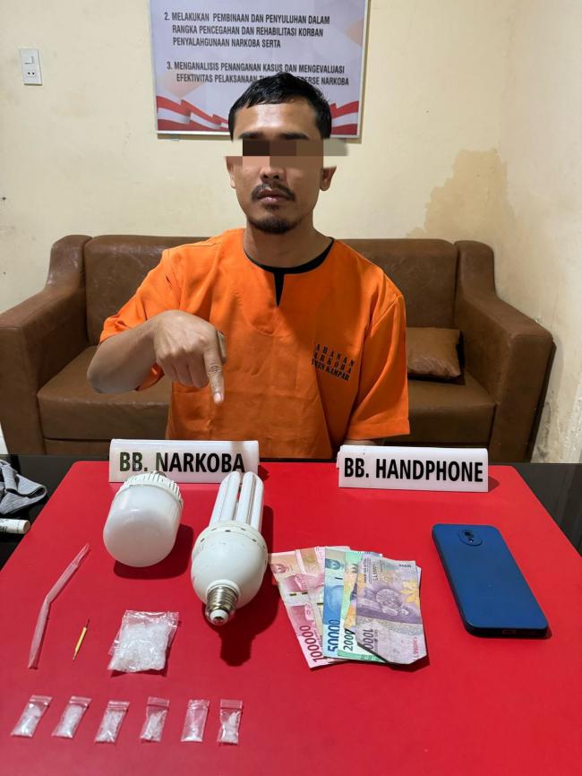 Selanjutnya dilakukan penggeledahan yang disaksikan oleh Perangkat Desa Setempat ditemukan 7 paket diduga Narkotika jenis Shabu yang dibungkus dengan plastik bening antara lain 6 paket dimasukkan didalam bola lampu yang digantung di gudang rumahnya dan 1 paket dimasukkan kedalam bola lampu yang digantung di warung sebelah rumahnya.
