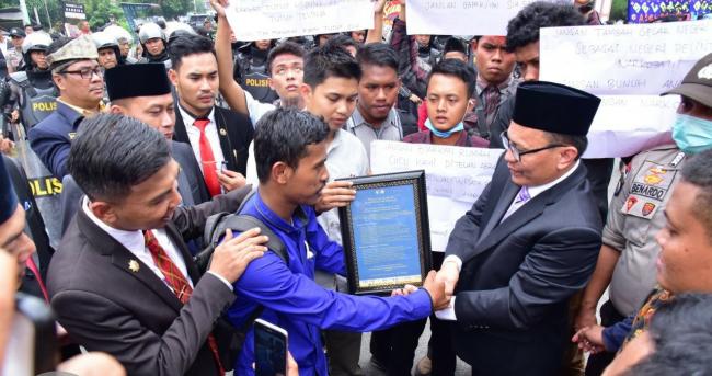 Ketua DPRD Sementara H. Khairul Umam bersama Wakil Ketua Syahrial, Kaderismanto, Nanang Haryanto dan Sekretaris DPRD Radius Akima menerima aksi damai dan aspirasi yang disampaikan Mahasiswa/i STAIN Bengkalis usai acara Paripurna Pengucapan Sumpah/Janji Anggota DPRD periode 2019 - 2024 di depan Gedung Cik Puan jalan Hangtuah Bengkalis