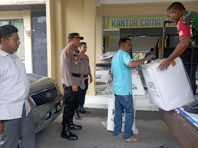 KUOK- Pergeseran logistik Pemilu dari Panitia Pemungutan Suara (PPS) Kelurahan Tampan ke Panitia Pemilihan Kecamatan (PPK) Kuok, Kabupaten Kampar di Kantor Camat Kuok berlangsung dengan lancar dan aman pada Kamis (15/02/2024).
