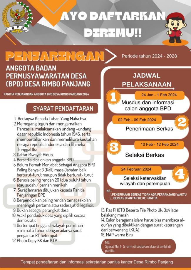 Sedangkan para calon yang akan di buat pemilihan penganti ben Zainal berkas mereka baru mulai di urus dengan waktu sampai selesai baru akan di lakukan pemilihan Kamis 29 februari 2024 dengan judul undangan musyawarah pemilihan anggota BPD dusun 3 desa Rimbo Rimbo panjang yang ditandatangani kadus 3 Aditya Rizkiando SE