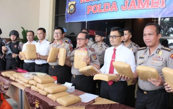 Polda Jambi menggelar Konferensi Pers pengungkapan upaya penyelundupan 29 kilogram Ganja