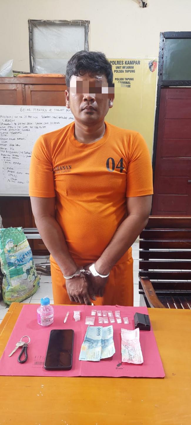 TAPUNG- Polsek Tapung berhasil mengamankan US (34) warga Desa Mukti Sari yang meresahkan warga karena peredaran Narkoba, darinya berhasil diamankan sabu-sabu berat bruto 3,25 gram, Jum'at (19/7/2024) sekira pukul 12.30 Wib.