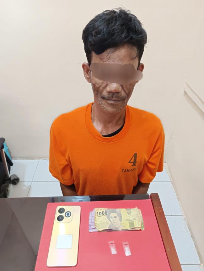 Penangkapan pelaku disaksikan 2 orang warga sekitar. Saat dilakukan pengeledahan ditemukan barang bukti berupa 2 paket kecil sabu yang dibungkus plastik putih bening, sebuah handphone dan uang tunai.