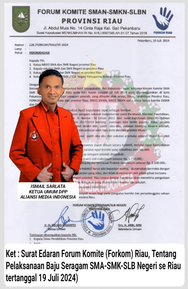 Didalam surat edaran yang dikeluarkan oleh Forum Komite (Forkom) Riau, bernomor : 226/Forkom/Riau/VII-2024 tertanggal19 Juli 2024 dengan perihal Rekomendasi yang ditanda tangani oleh Ir H Delesis Hasanto selaku Ketua Umum, dan Drs H.Arbi,MM. Menyatakan, Telah disepakati bersama dan di rekomendasi hasil keputusan rapat sebagai berikut :
