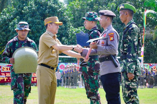 Kampar Kiri Hulu (RIAUPOS.CO) - Pj Bupati Kampar Hambali memimpin upacara pembukaan TNI Manunggal Membangun Desa (TMMD) ke-121 Kodim 0313/KPR di lapangan sepakbola mini gelora 45 Desa Gema, Kecamatan Kampar Kiri Hulu, Kabupaten Kampar, Rabu (24/7/2024).