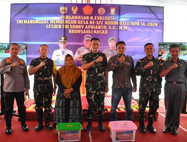 Kampar Kiri - Dalam rangka memastikan pelaksanaan program Tentara Manunggal Membangun Desa (TMMD) berjalan sesuai rencana dan memberikan dampak positif bagi masyarakat, Koorsahli Kasad Letjen TNI Sony Aprianto. S,E., M.M. melakukan peninjauan langsung ke lokasi TMMD ke 121 Kodim 0313/KPR T.A 2024 di Desa Tanjung Belit Selatan, Kec. Kampar Kiri, Kabupaten Kampar, Provinsi Riau. Kamis(8/8/2024)