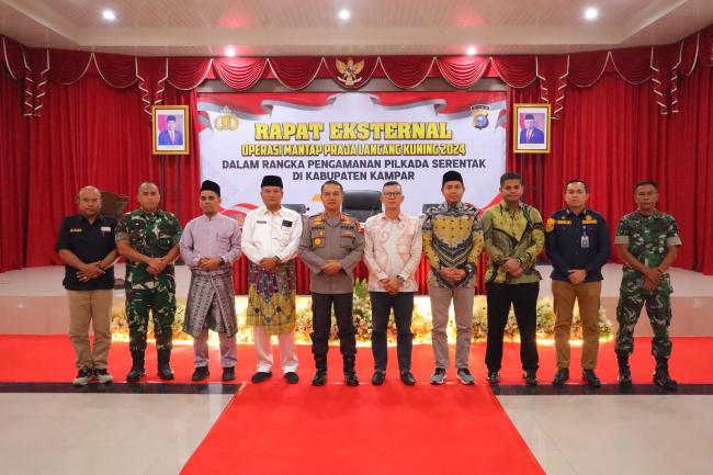 Rapat eksternal dipimpin langsung Kapolres Kampar AKBP Ronald Sumaja didampingi Forkopimda dan Kepala Instansi terkait. Seperti Pj Bupati Kampar atau yang diwakili Kalaksa BPBD Drs.Agustar, Dandim 0313/KPR atau yang diwakili, Kajari Kampar atau yang diwakili Jaksa Dikri, Ketua KPU Kampar Andi Putra, Ketua Bawaslu Kab.Kampar Syawir Abdullah dan lainnya.