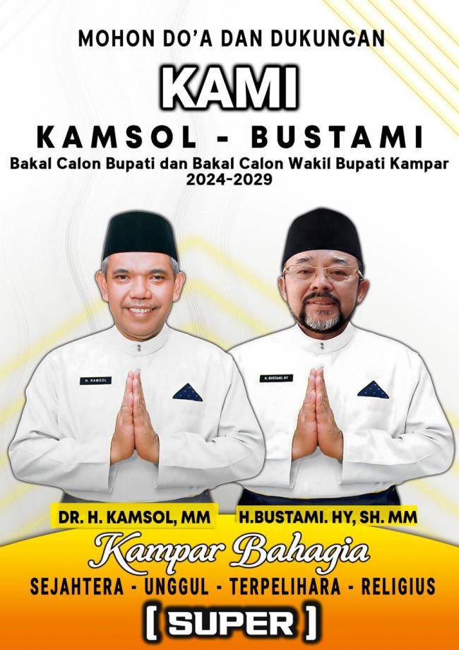 Atas dasar pengalaman yang segudang dalam kepemerintahan tersebut, maka setelah menelaah dan menganalisa kondisi realistis pembangunan kabupaten kampar serta disesuaikan dengan Kebutuhan Daerah Kabupaten Kampar saat ini, Pasangan ini berkomitmen menjadikan Kabupaten Kampar sebagai daerah yang “SUPER” Sejahtera, Unggul, Terpelihara, dan Religius, Dengan visi besar ini Kamsol - Bustami siap membawa Kampar Bahagia dan lebih baik kedepannya, terutama melalui peningkatan lima Fokus Utama Pembangunan Berkelanjutan