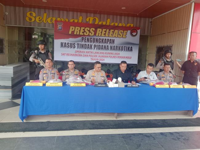 Kapolres Rohul menggelar press release pengungkapan kasus tindak pidana narkotika dalam Operasi Lancang Kuning 2024 yang berlangsung di halaman depan Polres Rokan Hulu. Selasa (20/08/2024).