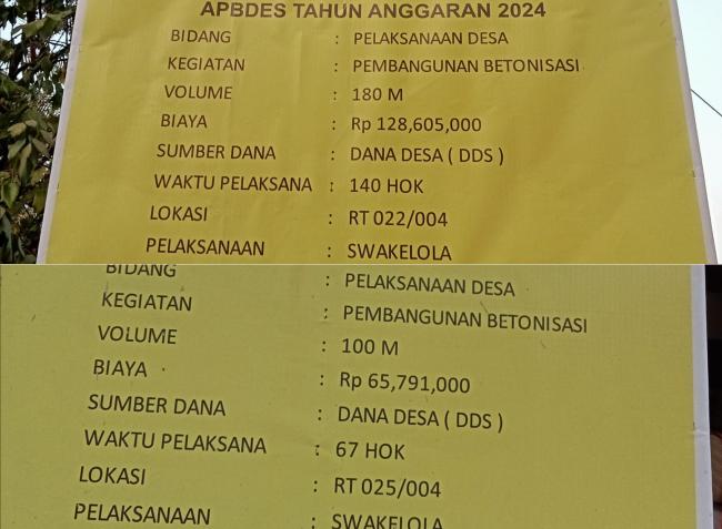 Diketahui dalam papan informasi kegiatan, dua proyek betonisasi jalan tersebut masing-masing menelan anggaran senilai Rp. 128.605.000 dan Rp. 65.791.000 dengan volume 180 m dan 100 m. Sampai berita ini diterbitkan, belum ada klarifikasi dari pihak manapun terkait kegiatan tersebut. (Asep Kelonx)