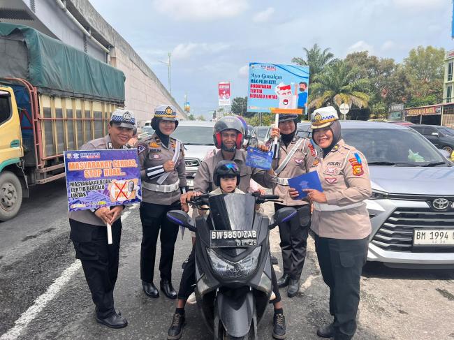"Kita melaksanakan kegiatan Kampanye Keselamatan dalam rangka pelaksanaan Operasi Zebra Lancang Kuning 2024 guna meningkatkan kesadaran dan kepatuhan masyarakat dalam berkendara, kemudian kita juga menyampaikan himbaun Cooling System Pilkada Riau 2024, seperti yang kita ketahui bersama jelang pelantikan Presiden dan Wakil Presiden terpilih pada Pemilu 2024, kita harapkan masyarakat tidak mudah terprovokasi, bijak mengunakan media sosial dan selalu mematuhi tata tertib berlalu saat berkendara," ujar Kompol Sunarti.