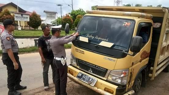Anggota personil Polsek Tapung Hulu melaksanakan kegiatan pembagian stiker himbauan keselamatan berlalu lintas kepada pengguna jalan yang melintas.