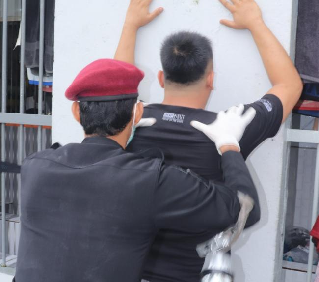 Petugas melaksanakan penggeledahan badan dan barang secara tertib, penghuni dikeluarkan satu persatu sementara petugas yang lain melakukan penyisiran/penggeledahan kamar.