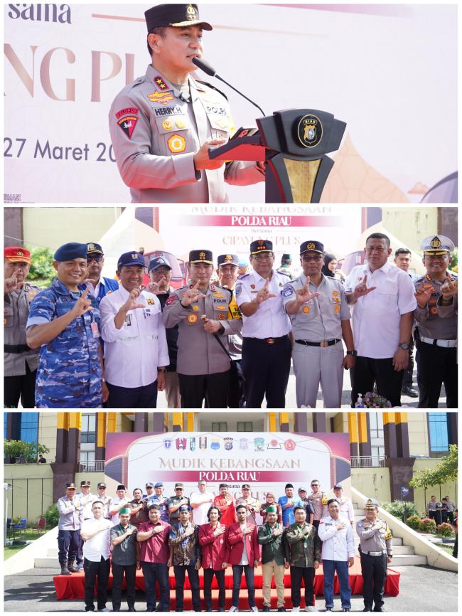 "Di pagi yang berbahagia ini, kita kembali bisa memberikan fasilitas untuk mudik gratis kepada masyarakat Riau dan Kota Pekanbaru Khususnya, untuk di Polda Riau sendiri kita berangkatan sebanyak empat bus dan tujuan Provinsi Sumatra Utara dan Provinsi Sumatra Barat, dan kita berharap sanak saudara kita yang ikut mudik pada hari ini bisa sampai ke tujuan dengan selamat dan bisa bertemu dengan sanak saudaranya, kepada seluruh peserta mudik gratis tolong sampaikan salam kami kepada sanak saudaranya, dan mohon maaf lahir dan batin," ucap Irjen Pol Herry sembari melepas para pemudik.