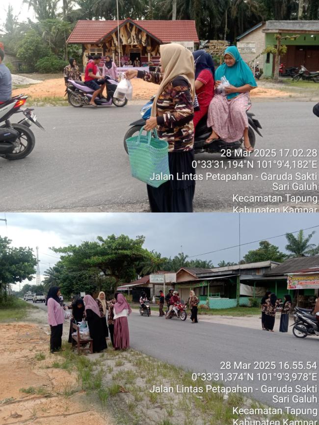 Kampar. Tapung--Dalam semangat kebersamaan dan kepedulian sosial di bulan suci Ramadan, Gerakan Muda FKPPI (GM FKPPI), GP Ansor, Banser, dan Karang Taruna Desa Sari Galuh menggelar kegiatan berbagi takjil gratis kepada warga yang melintas di depan Gedung GM FKPPI, Jl. Garuda Sakti KM 30, Desa Sari Galuh, Kecamatan Tapung, Kabupaten Kampar, Jumat (28/03/2025) sore.