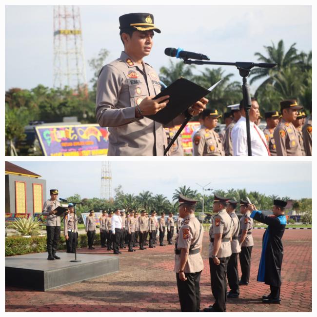 Pelaksanaan upacara berlangsung tertib dengan susunan lengkap pejabat upacara dan kekuatan pasukan yang terdiri dari gabungan satuan dan fungsi di lingkungan Polres Rokan Hulu. Suasana semakin khidmat saat pembacaan amanat oleh Kapolres, yang menyampaikan rasa syukur atas kelancaran kegiatan serta apresiasi mendalam kepada pejabat lama atas dedikasi dan kontribusi selama bertugas.