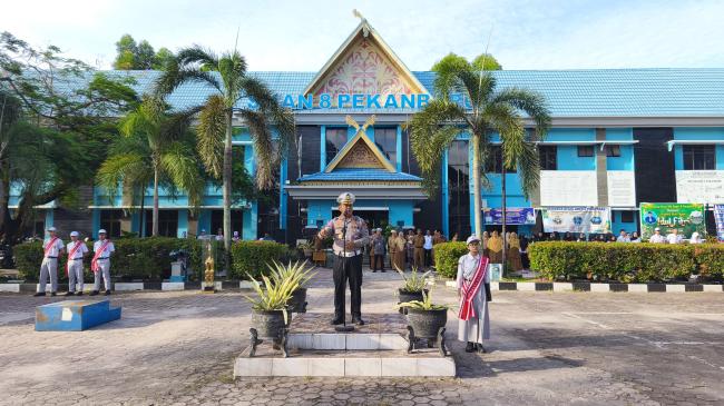"Alhamdulillah, pagi ini sekitar pukul 07.00 WIB kami kembali melaksanakan rangkaian kegiatan Police Goes to School bersama para siswa-siswi SMAN 8 Pekanbaru. Dimulai dengan upacara, dilanjutkan edukasi Kamseltibcarlantas, serta pembagian helm, brosur, dan tumbler sebagai buah tangan kepada para pelajar," jelas Kombes Pol Taufiq Lukman.
