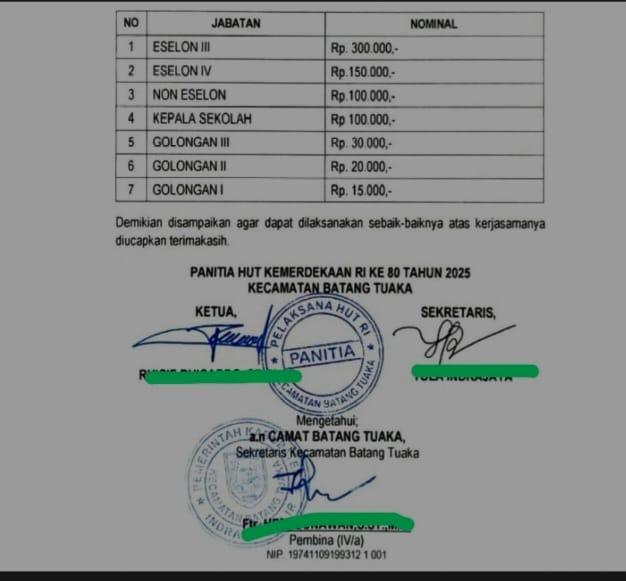 Peringatan Hari Ulang Tahun ke-80 Republik Indonesia di Kecamatan Batang Tuaka, Kabupaten Indragiri Hilir, diduga tercoreng praktik pungutan liar (pungli) yang melibatkan panitia tingkat kecamatan. Informasi yang dihimpun menyebutkan, pungutan ini dilakukan dengan mematok nominal berdasarkan jabatan ASN, dipimpin oleh seorang pejabat eselon III.