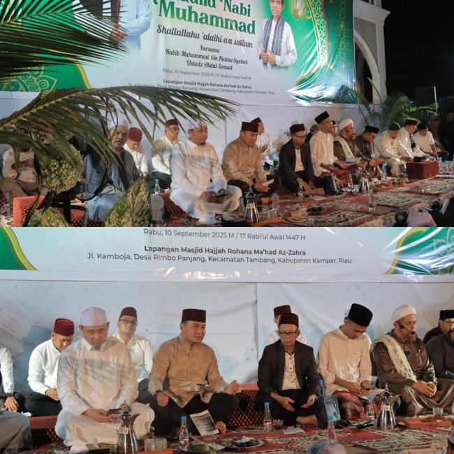 RIMBO PANJANG - Lapangan Masjid Hj. Rohana Ma'had Az-Zahra di Jalan Kamboja, Desa Rimbo Panjang, Kecamatan Tambang, Kabupaten Kampar, dipadati ribuan jamaah pada Rabu (10/9/2025) malam. Mereka hadir untuk mengikuti Tabligh Akbar Maulid Nabi Muhammad SAW bersama Habib Muhammad Bin Haidar Syahab.