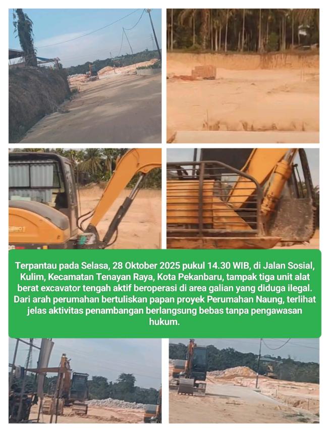 Selasa, 28 Oktober 2025 sekira pukul 14.30 WIB, tim media Kupaskabar.com mendapati tiga unit alat berat jenis excavator tengah aktif beroperasi di kawasan Jalan Sosial, Kulim, Tenayan Raya. Suara deru mesin dan debu pekat terlihat jelas dari kejauhan, menandakan kegiatan penambangan yang terus berjalan hingga sore hari.